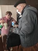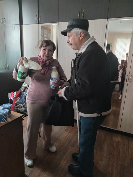 Председатель Брянской МО ВОС Светлана Валерьевна Бортник поздравила присутствующих с наступающим праздником Светлой Пасхи и вручила наборы молочной продукции в качестве гуманитарной помощи.