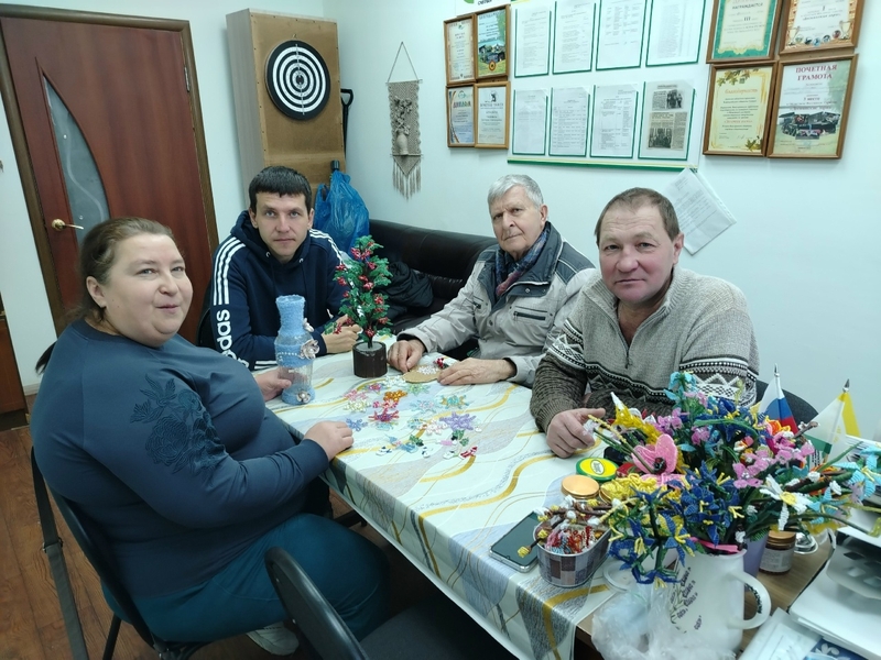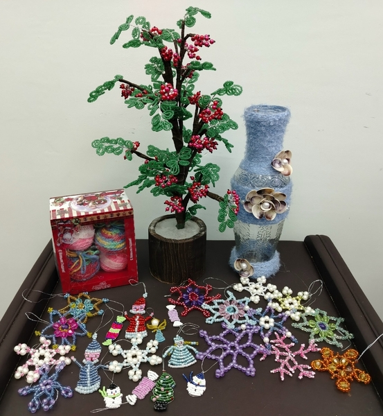 Участники встречи завершили поделку из бисера «Рябина», которую мастерили совместными усилиями в течение двух месяцев. В декабре были изготовлены новогодние ёлочные украшения из бисера, бусин, ниток, стекляруса, ткани и ниток.