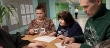Участники разгадывают кроссворд "В мире русской литературы". Задания кроссворда напечатаны шрифтом Брайля.