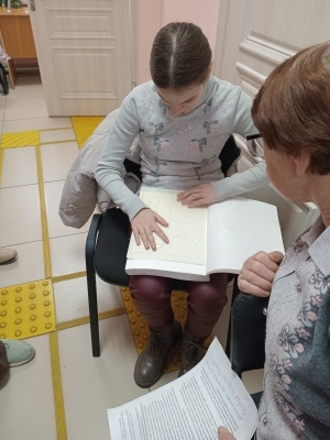Ребёнок-инвалид по зрению Галина Федоренко рассказала о Трубчевской школе для слепых и слабовидящих, учащейся которой она является, показала свои умения чтения и письма по Брайлю, с благодарностью отозвалась о преподавателях школы. От МО ВОС матери Галины, члену ВОС Анжеле Николаевне Федоренко была вручена материальная помощь.