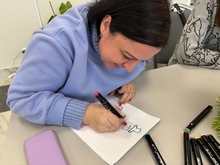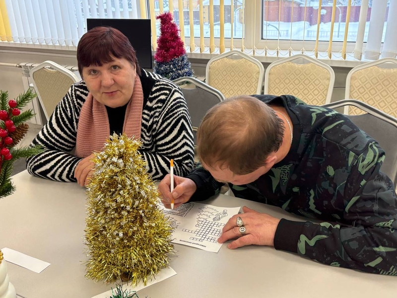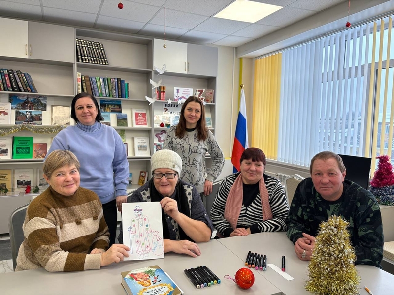 Анастасия Сергеевна провела для участников мероприятия увлекательные, познавательные и веселые конкурсы «Правда или вымысел» и «Новогодний кроссворд». Далее участникам было предложено нарисовать Деда Мороза: каждый рисовал одну деталь, которую называла ведущая, и сделать это надо было разными способами, например, левой рукой, с закрытыми глазами, зажав фломастер локтем и др. Конкурсы вызвали смех и бурю положительных эмоций!
