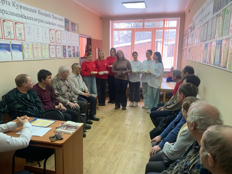 19 февраля в день Масленичной недели «Разгуляй» в кабинете реабилитации Клинцовской местной организации состоялась встреча с «Движением первых», которые поздравили членов организации с праздником Масленицы. Всем участникам мероприятия было приятно, что ребята из «Движения первых» самостоятельно приготовили угощения: блины и ватрушки.